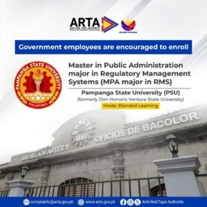 The Anti-Red Tape Authority (ARTA) has further strengthened its commitment to good governance and regulatory reform through a partnership with Pampanga State University (PSU) (formerly Don Honorio Ventura State University) to offer a degree in Master in Public Administration (MPA) major in Regulatory Management Systems (RMS). This is pursuant to the Memorandum of Understanding dated 6 November 2023.