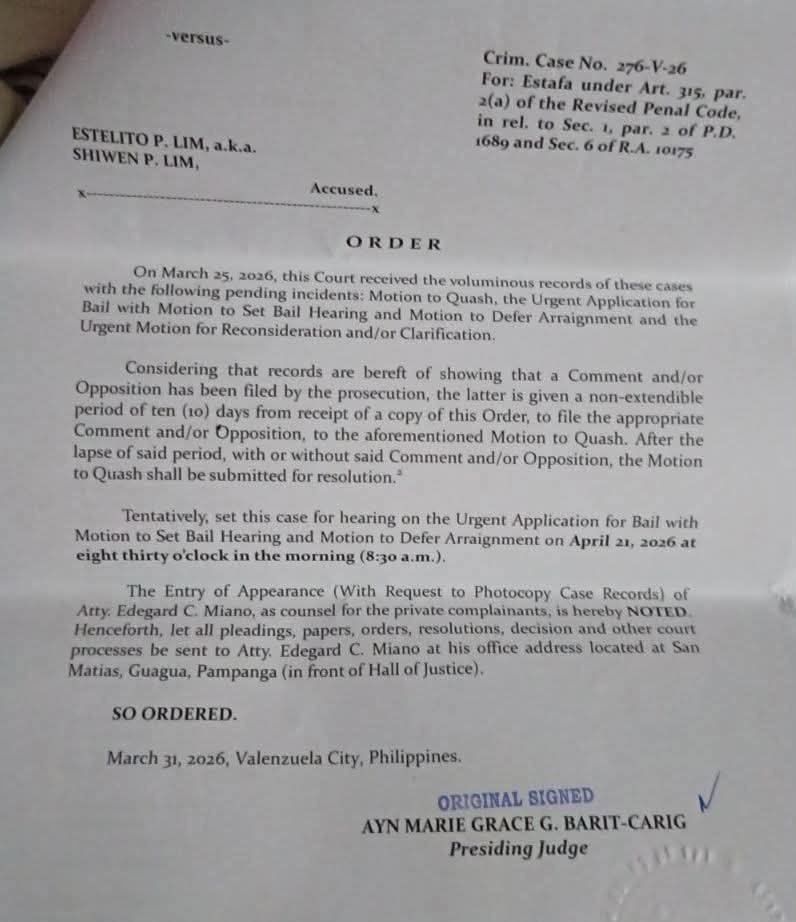 Aside from this, Lim also has pending warrants for other cases, posting bail of P18,000 for each count in three estafa cases sometime in August last year.