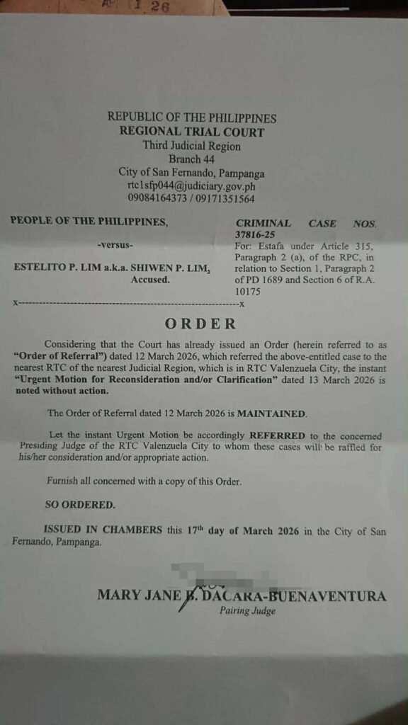 This came after the 10 criminal cases against Lim has been referred by Presiding Judge Mary Jane Dacara-Buenaventura of the Regional Trial Court Branch 44 to the nearest judicial region, which is RTC Valenzuela City.