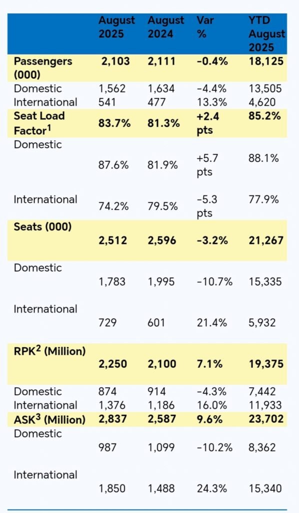 Domestic passengers decreased by 4.4% versus August 2024 on 10.7% lower seats, with a domestic SLF increasing by 5.7pts to 87.6%. International passenger traffic, meanwhile, grew 13.3% year-over-year on 21.4% higher seats, which resulted in a 5.3pts decrease in SLF to 74.2%.