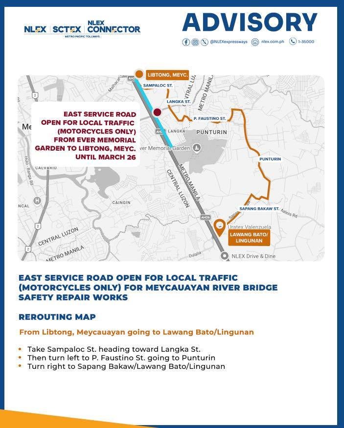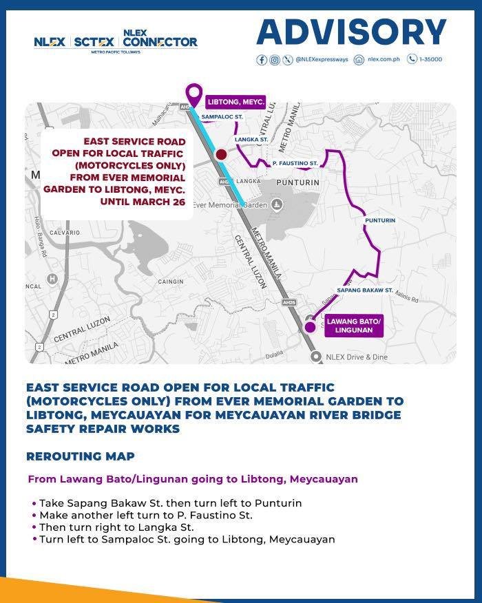 Additionally, one lane of the East Service Road, between Ever Memorial Park in Lawang Bato, Valenzuela, and Libtong, Meycauayan, is being used as a compensating lane for vehicles traveling north during the closure.