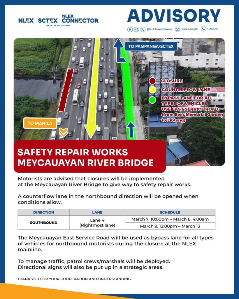 Motorists can view alternate routes on NLEX Corporation’s official social media pages. Traffic marshals and directional signs will guide motorists during the project.
