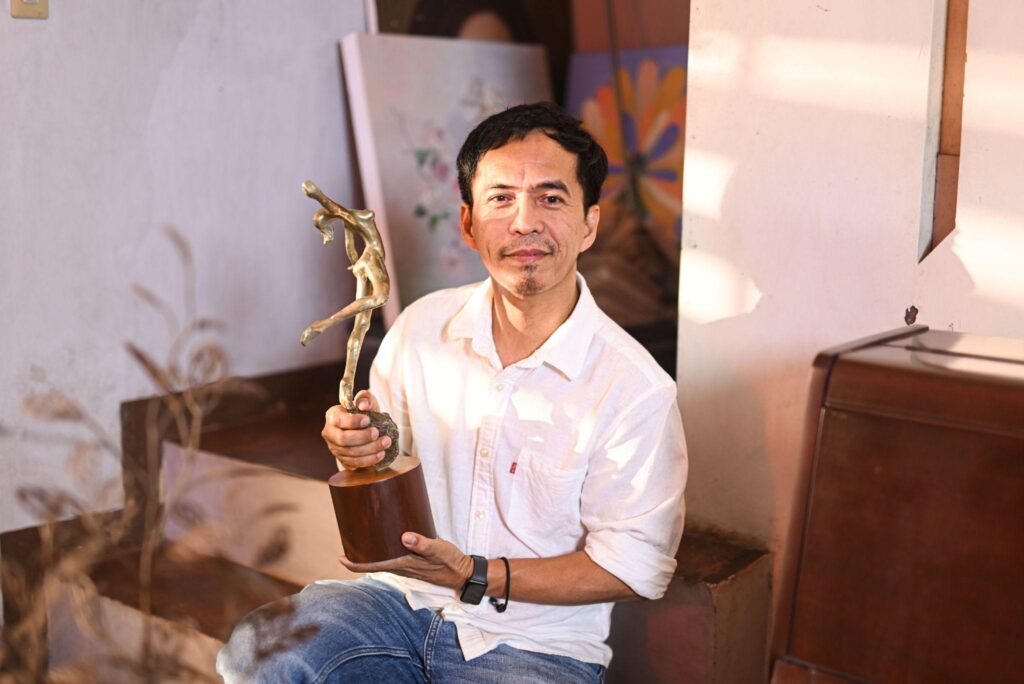 Filipino visual artist Eric Masangkay holds the finished trophy for the 4th Gawad Madiskarte.