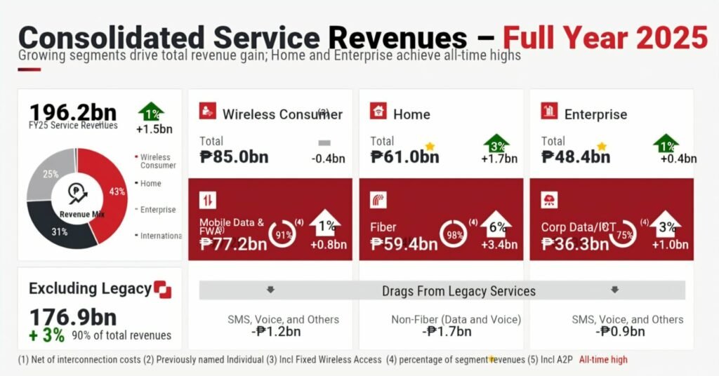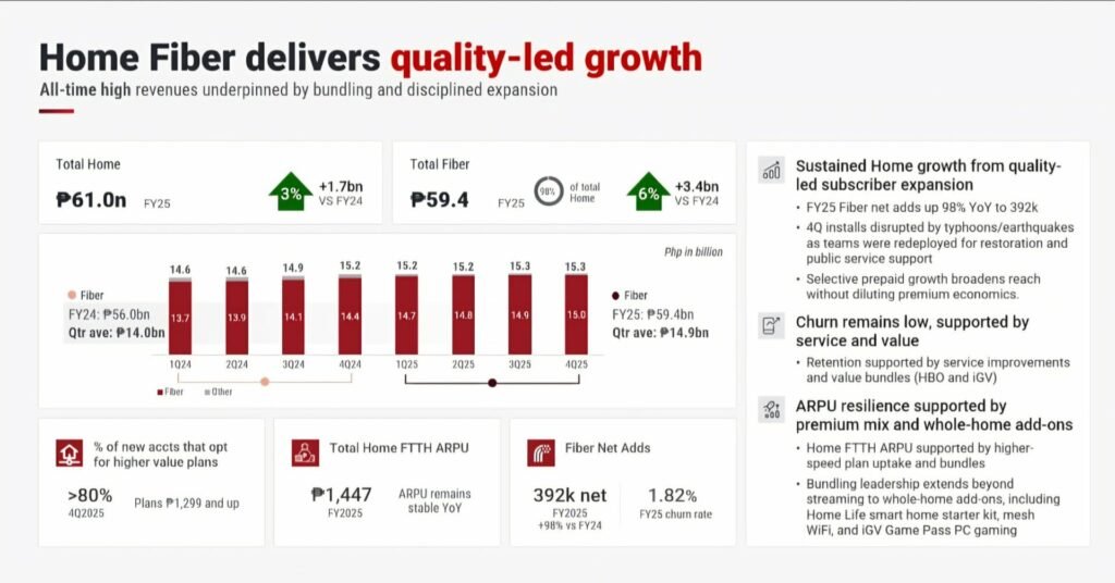 For 2025, total Home revenues rose 3%, or ₱1.7 billion, to ₱61 billion, while Fiber revenues grew 6%, or ₱3.4 billion, to ₱59.4 billion.