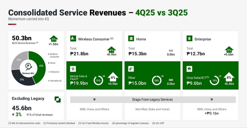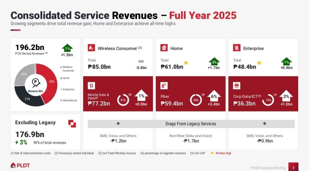 PLDT Inc. reported Gross Service Revenues growth of 2% to ₱212.2 billion, while Net Service Revenues (net of interconnect costs) rose 1% to a record ₱196.2 billion in 2025.