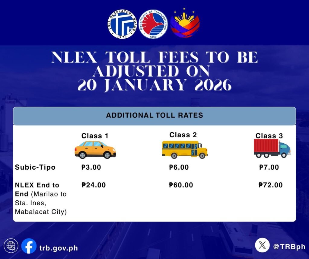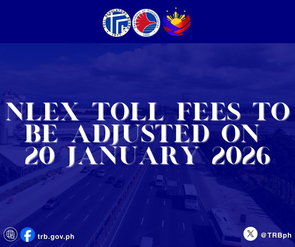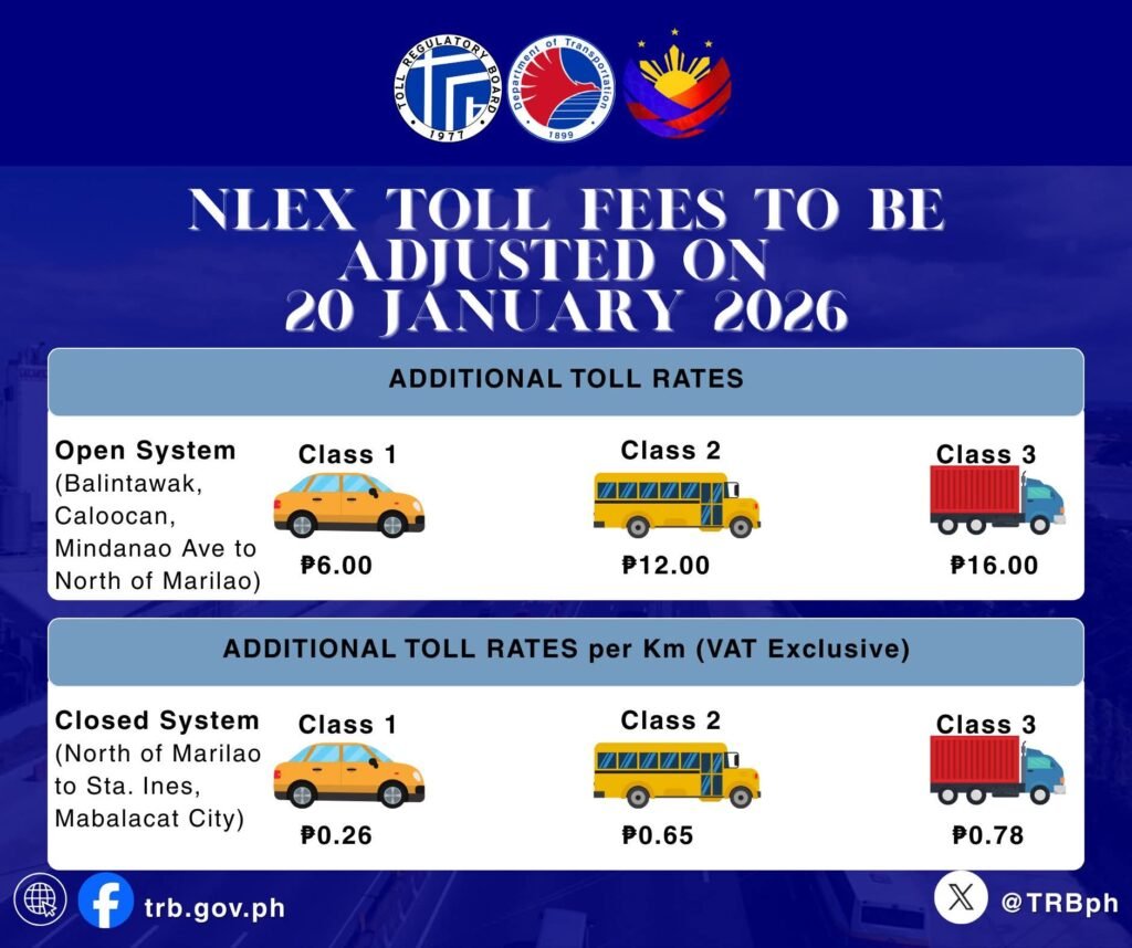 The Toll Regulatory Board (TRB) has authorized NLEX to adjust its toll by ₱6 in the open system and ₱0.26 per kilometer in the closed system effective January 20, 2026.
